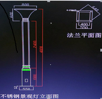 灯杆主体:高度4米,底部为410mm*410mm*1000mm,中部为310mm*310mm*2400mm,采用优质2.5mm304不锈钢制作,气体保护焊接成型,表面经打磨处理后喷涂抗盐耐腐,防紫外线户外用塑粉,