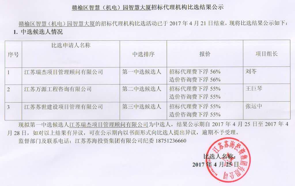 赣榆区智慧(机电)园智慧大厦招标代理机构比选结果公示