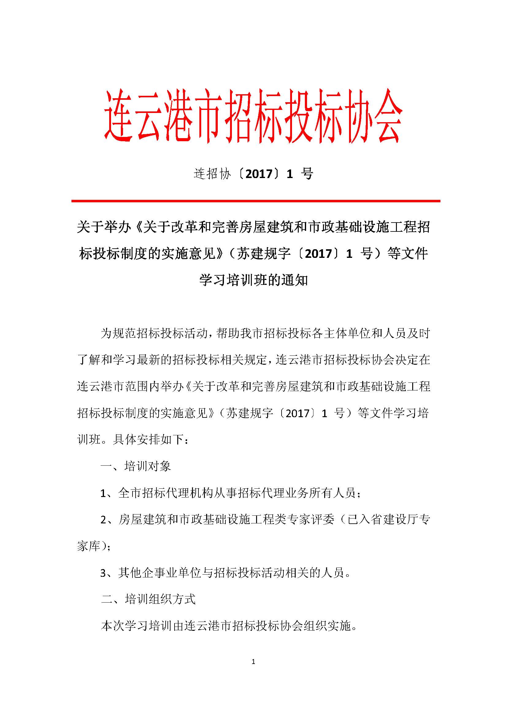 关于举办《关于改革和完善房屋建筑和市政基础设施工程招标投标制度的实施意见》(苏建规字〔2017〕1 号)等文件学习培训班的通知