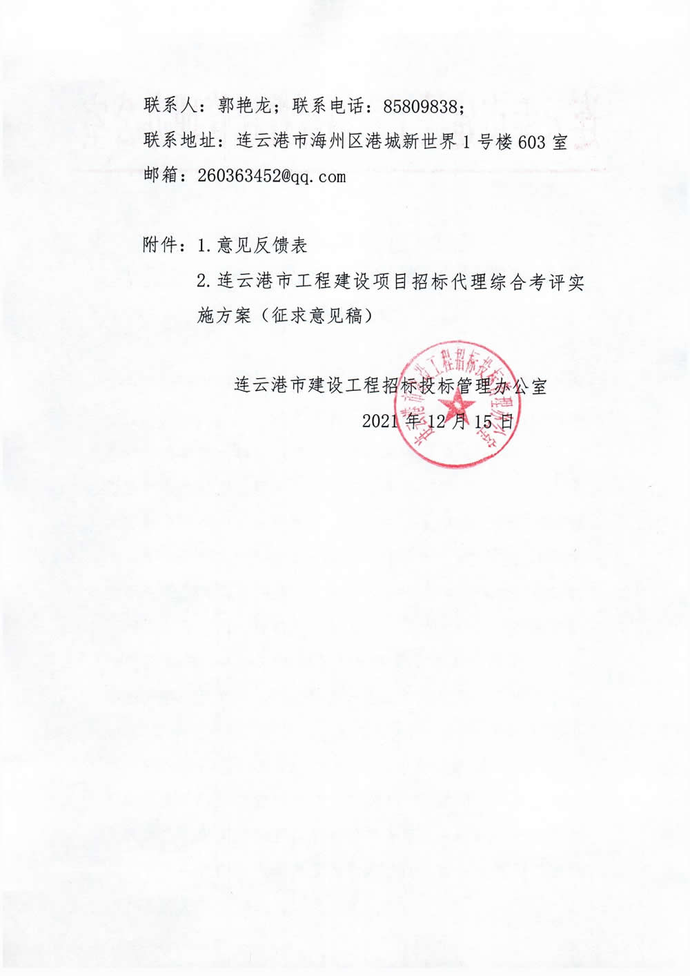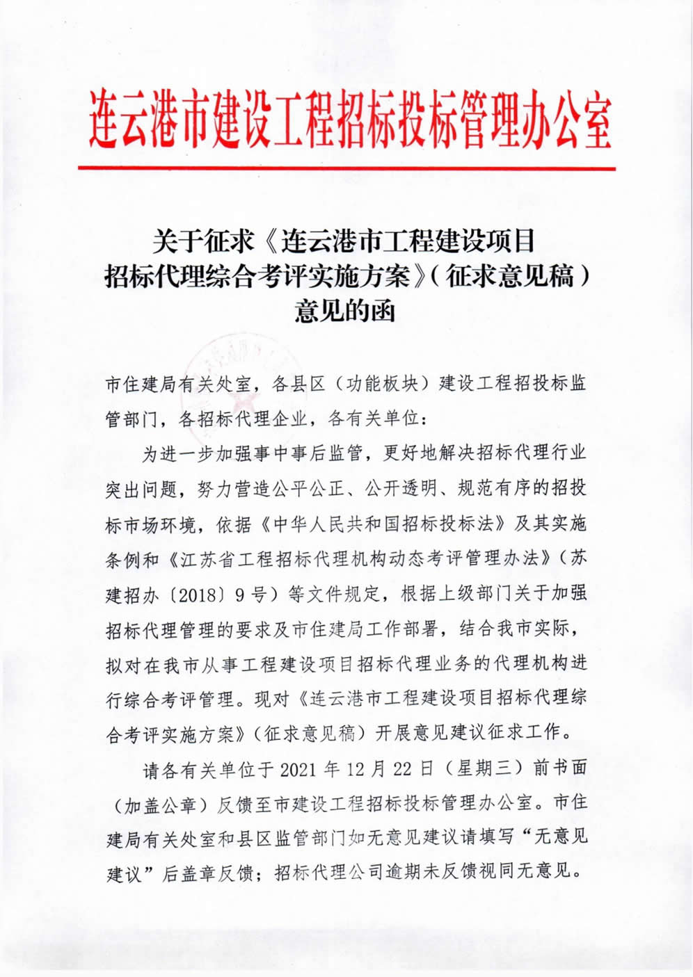 关于征求《连云港市工程建设项目招标代理综合考评实施方案》(征求意见稿)意见的函