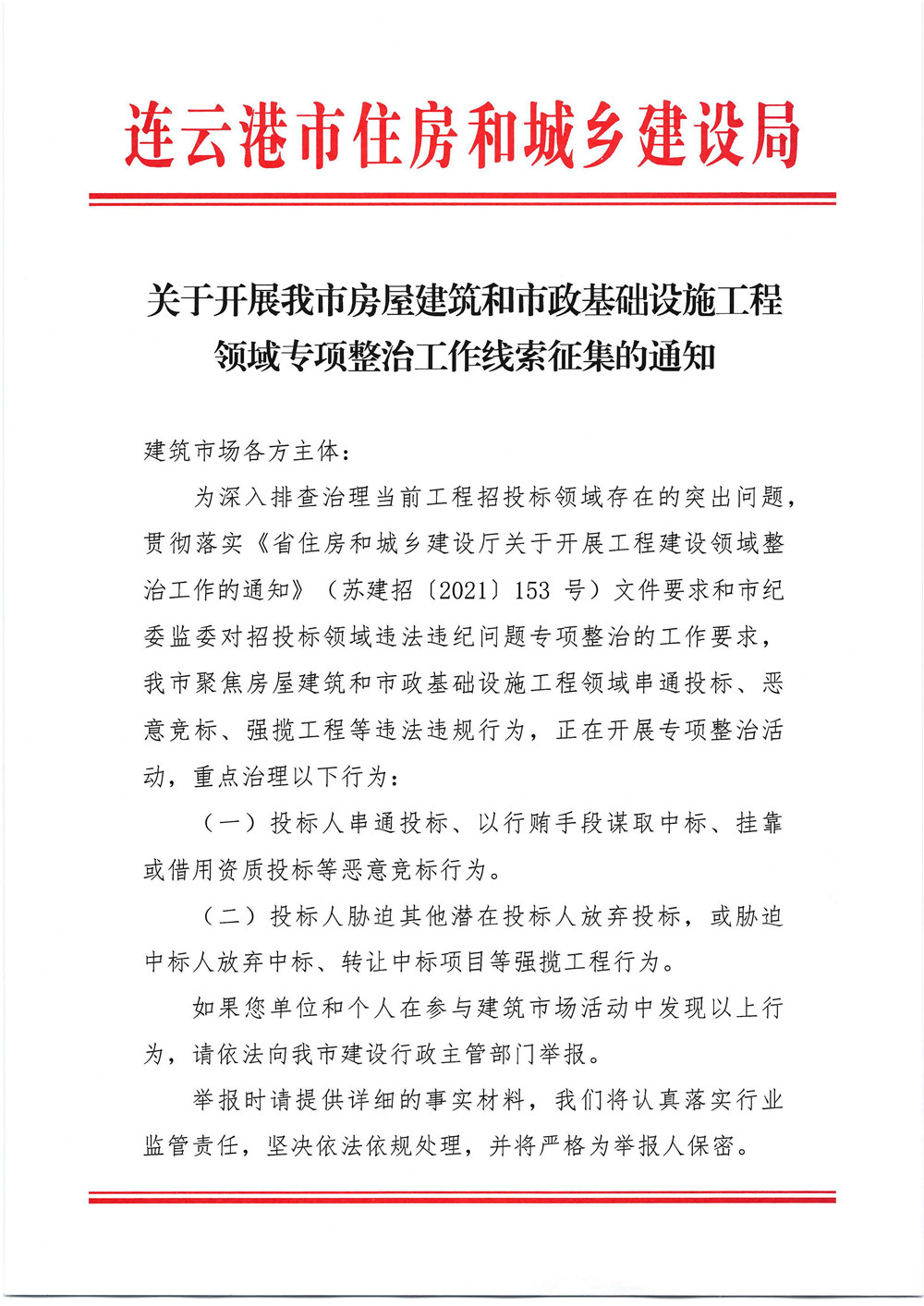 关于开展我市房屋建筑和市政基础设施工程领域专项整治工作线索征集的通知