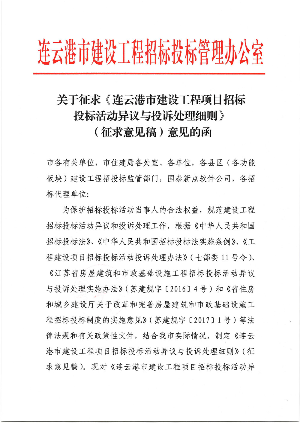 关于征求《连云港市建设工程项目招标投标活动异议与投诉处理细则》(征求意见稿)意见的函