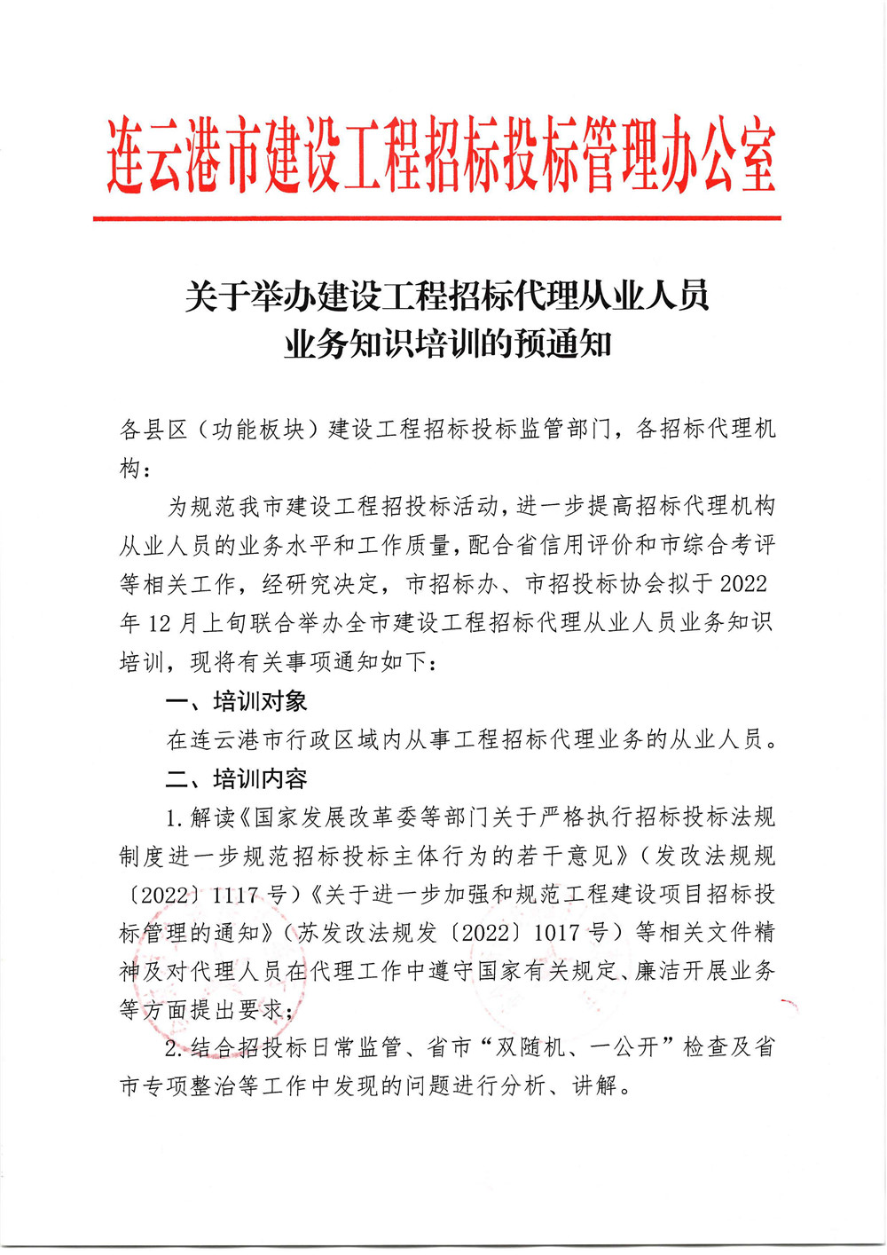 关于举办建设工程招标代理从业人员业务知识培训的预通知