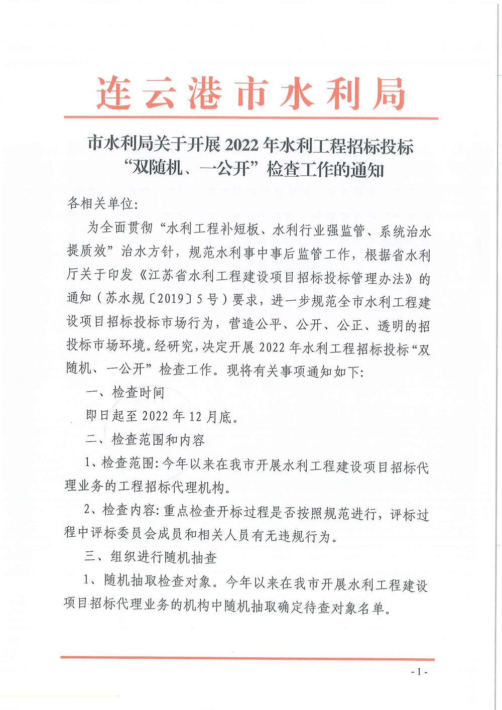 市水利局关于开展2022年水利工程招标投标“双随机、一公开”检查工作的通知