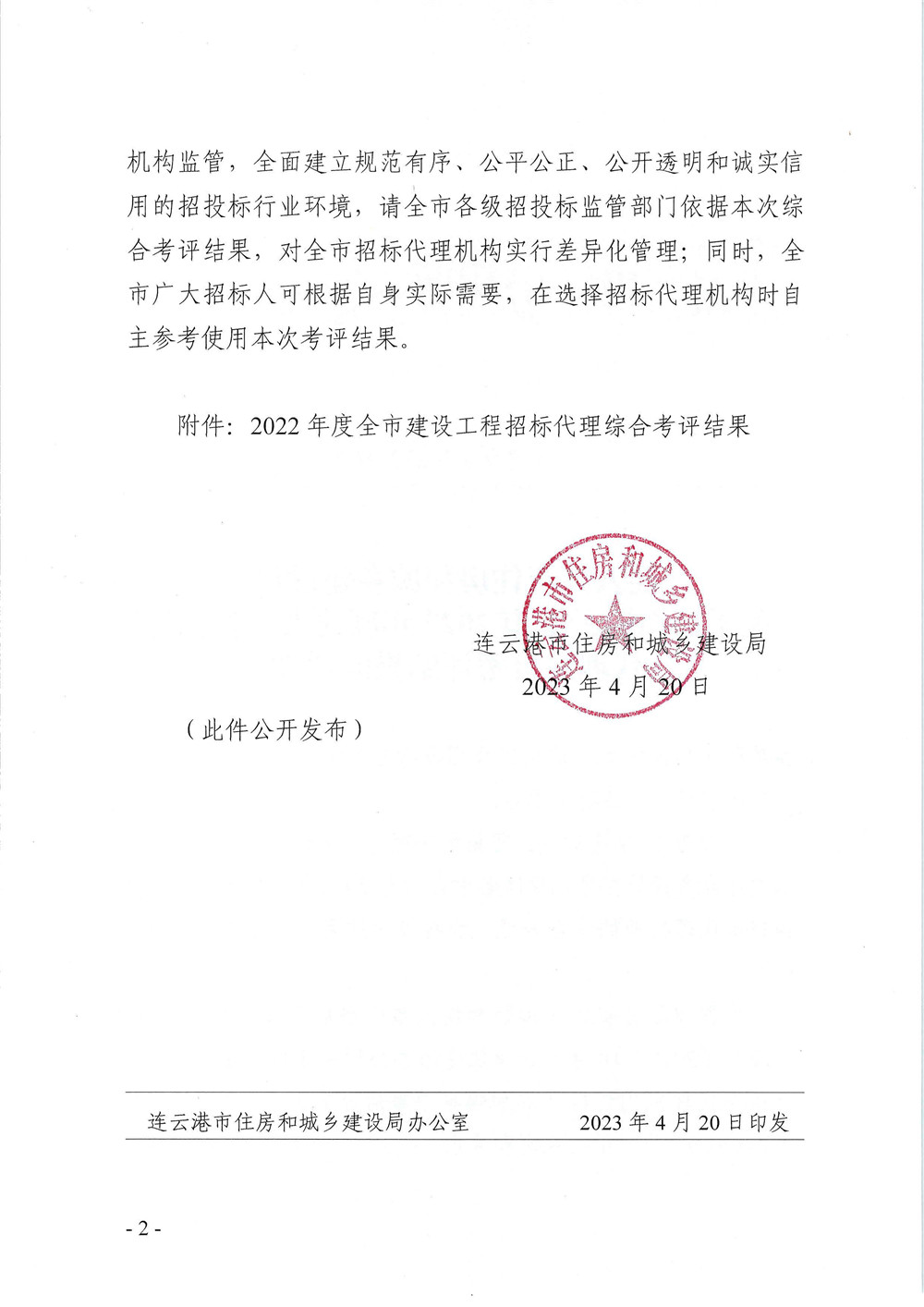 关于公布连云港市2022年度建设工程招标代理综合考评结果的通知
