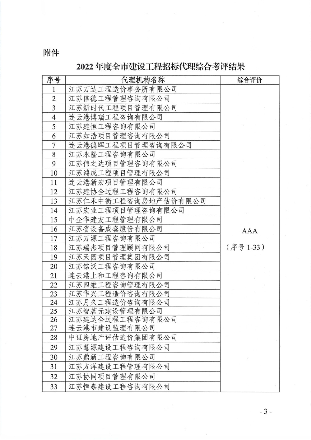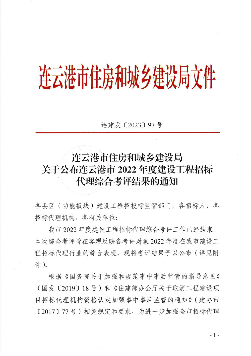 连建发〔2023〕97号(关于公布连云港市2022年度建设工程招标代理综合考评结果的通知).doc