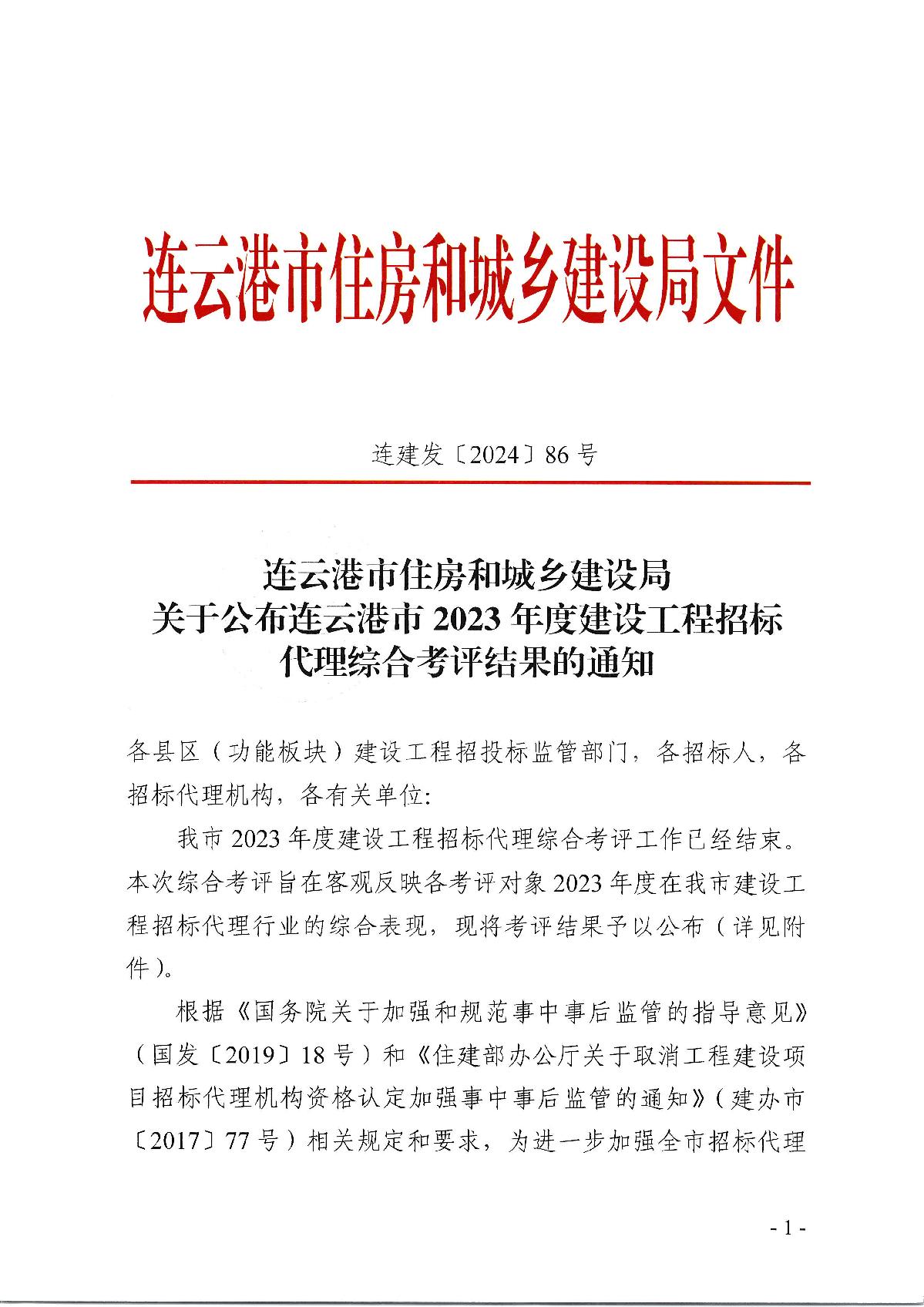 • 连建发〔2024〕86号连云港市2023年度建设工程招标代理综合考评结果.pdf