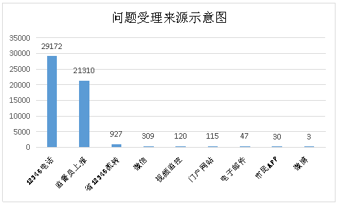 1.按受理来源分:12月份,市12345电话受理29172件,占案件总数的56.06%;监督员上报21310件,占总数的40.95%;省12345在线平台流转927件,占总数的1.78%;微信309件,占总数的0.59%;视频监控120件,占总数的0.23%;门户网站115件,占总数的0.22%;电子邮件47件,市民APP30件,微博3件。