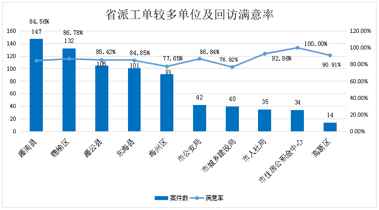 12月份,省12345平台流转工单927件,较上月增加91件,及时签收率97.09%,按时办结率88.93%,回访满意率84.99%。省派工单涉及较多的单位有灌南县(147件)、赣榆区(132件)、灌云县(105件)、东海县(101件)、海州区(91件)、市公安局(42件)、市城乡建设局(40件)、市人社局(35件)、市住房公积金中心(34件)、高新区(14件)等。省派工单回访满意率最高的是市住房公积金中心(100%),较低的是市城乡建设局(76.92%)和海州区(77.65%)。