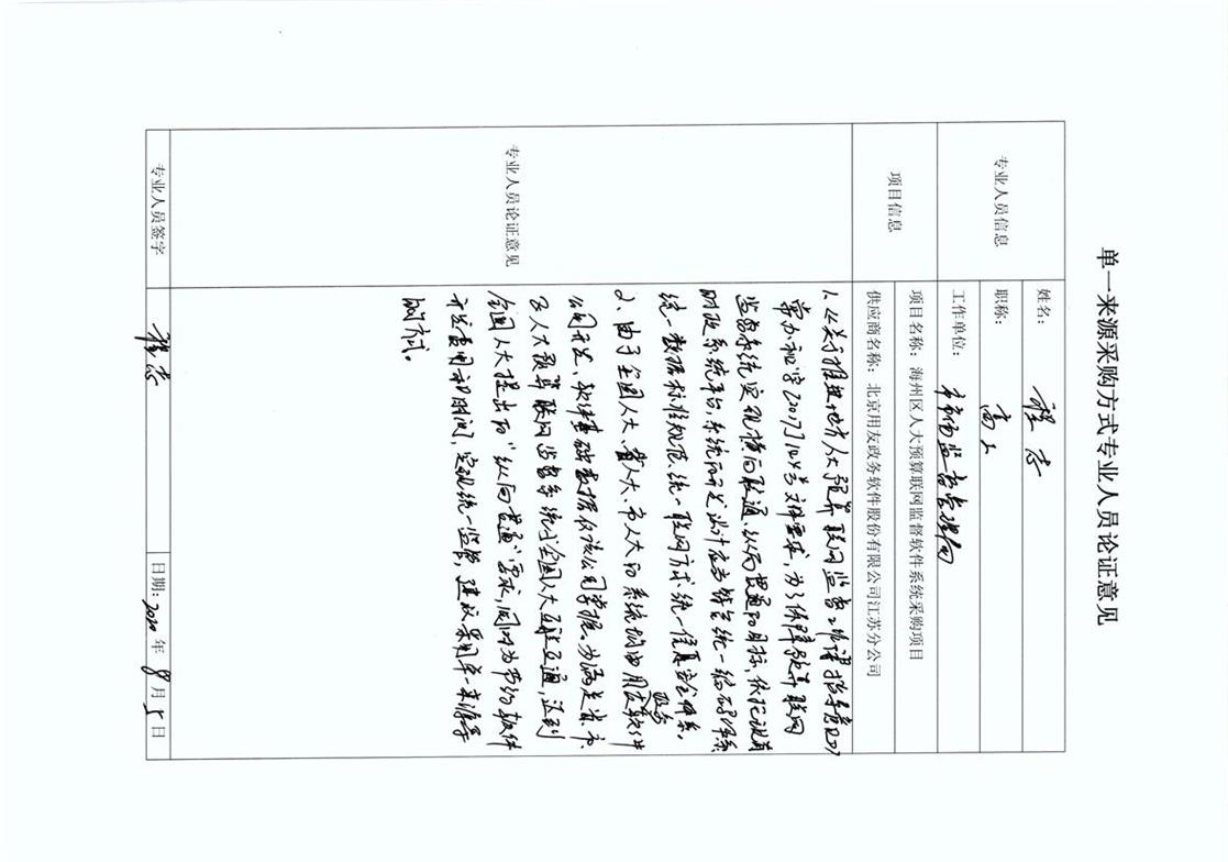 2.由于全国人大基础版,省人大采用并推广的“南京版”均由北京用友政务软件股份有限公司开发,软件基础数据仅该公司掌握,为满足本项目与省、市、区人大互联互通,达到全国人大提出的“纵向贯通”要求,同时为节约软件开发费用和时间避免重复建设,实现统一监管,建议向用友政务软件公司采购该系统。