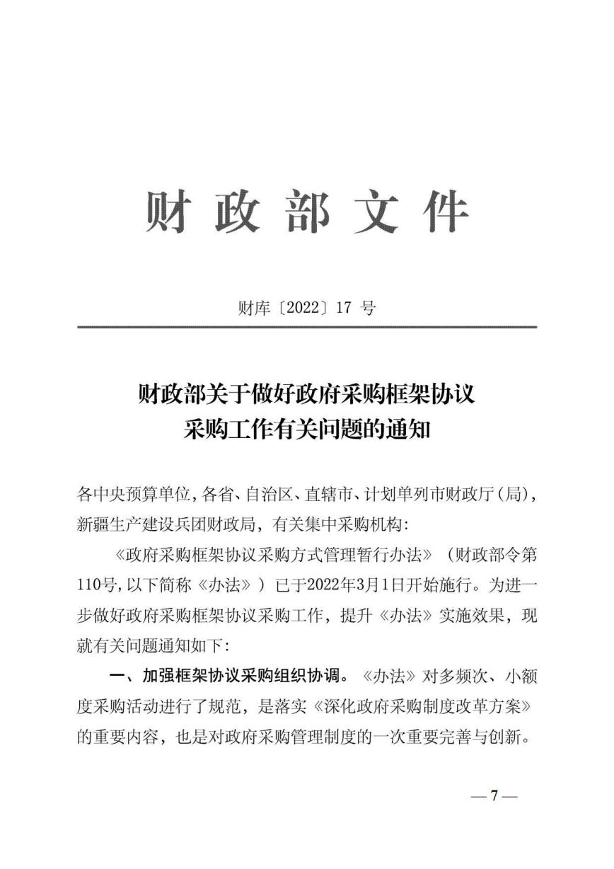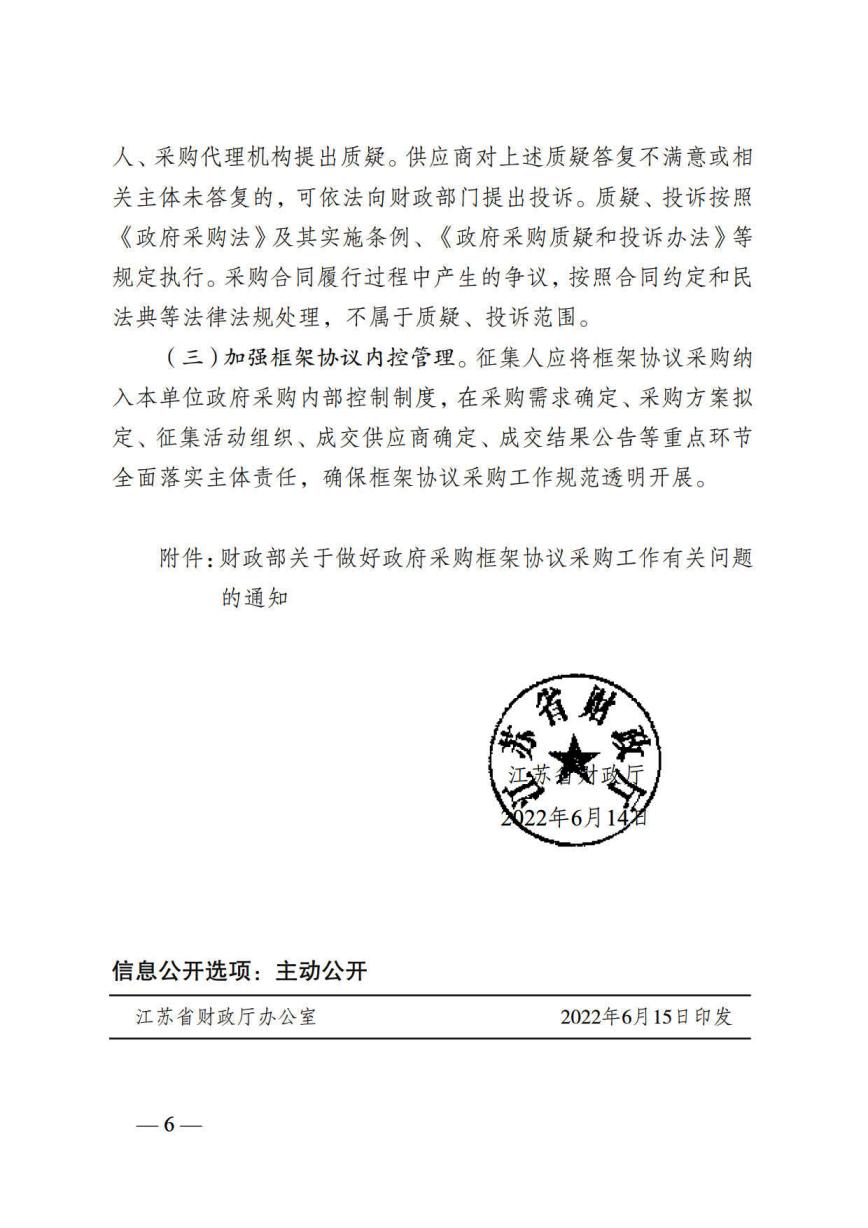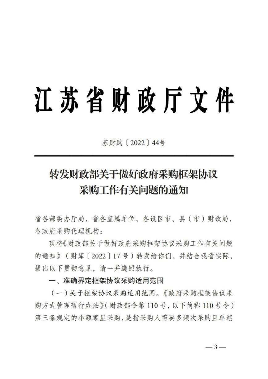 转发财政部关于做好政府采购框架协议采购工作有关问题的通知(苏财购〔2022〕44号)