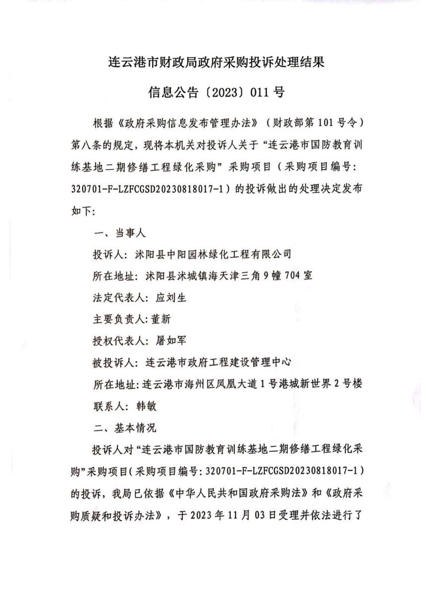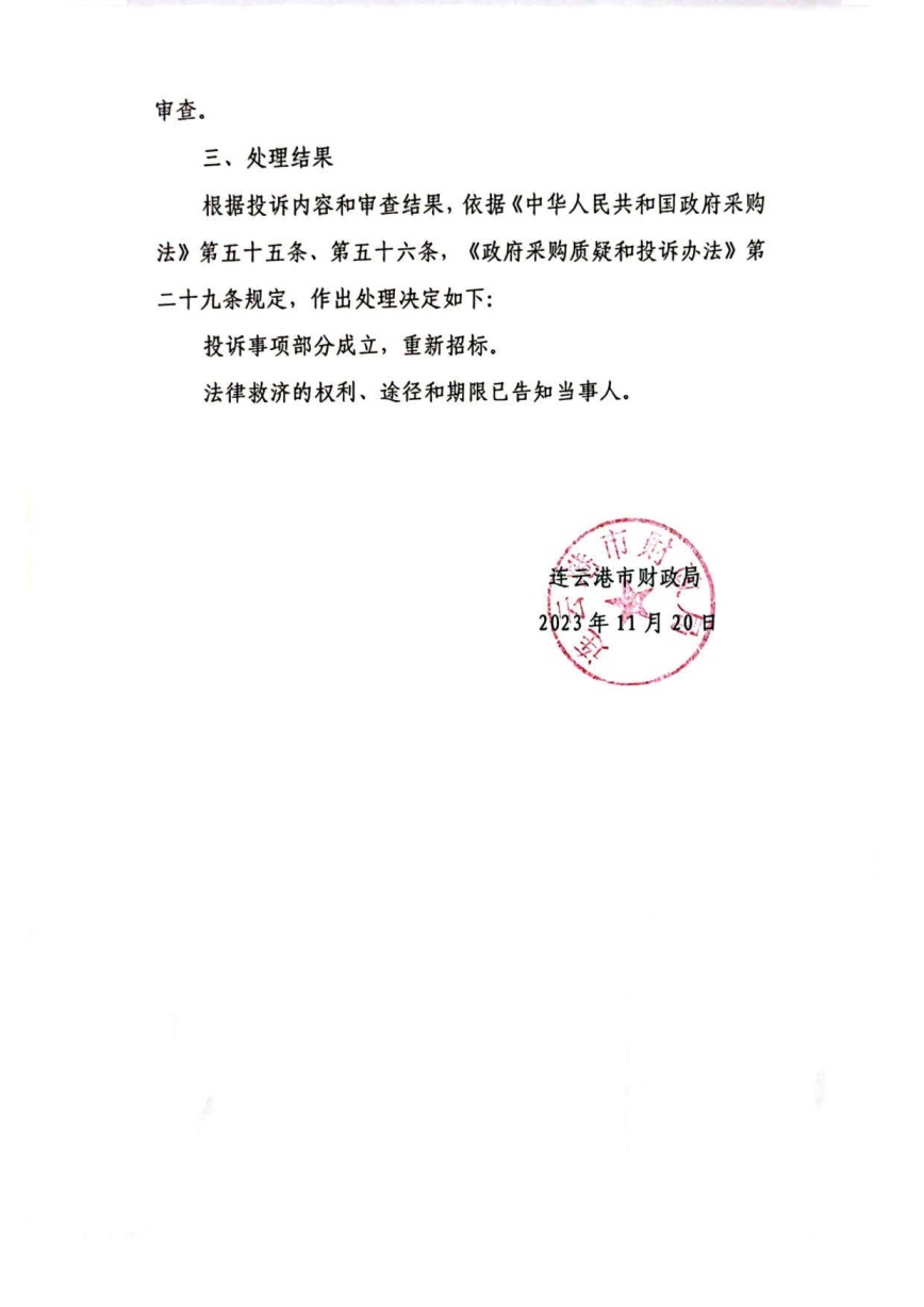 连云港市财政局政府采购投诉处理结果信息公告〔2023〕011号