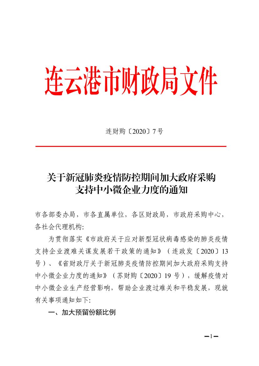 关于新冠肺炎疫情防控期间加大政府采购支持中小微企业力度的通知(连财购〔2020〕7号)
