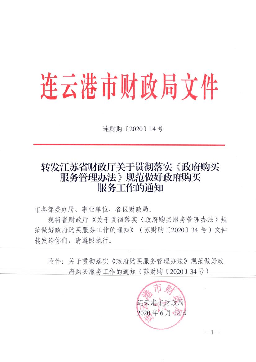 转发江苏省财政厅关于贯彻落实《政府购买服务管理办法》规范做好政府购买服务工作的通知(连财购〔2020〕14号)