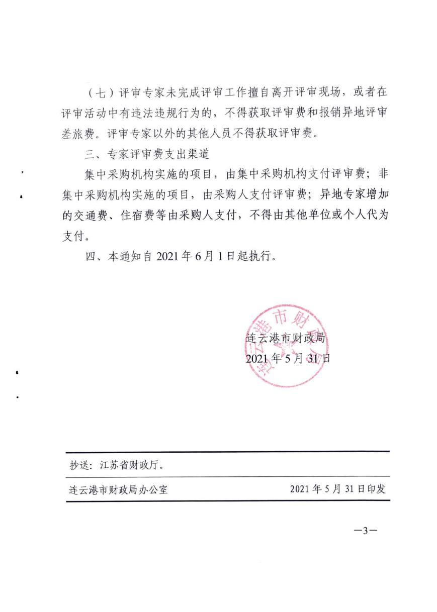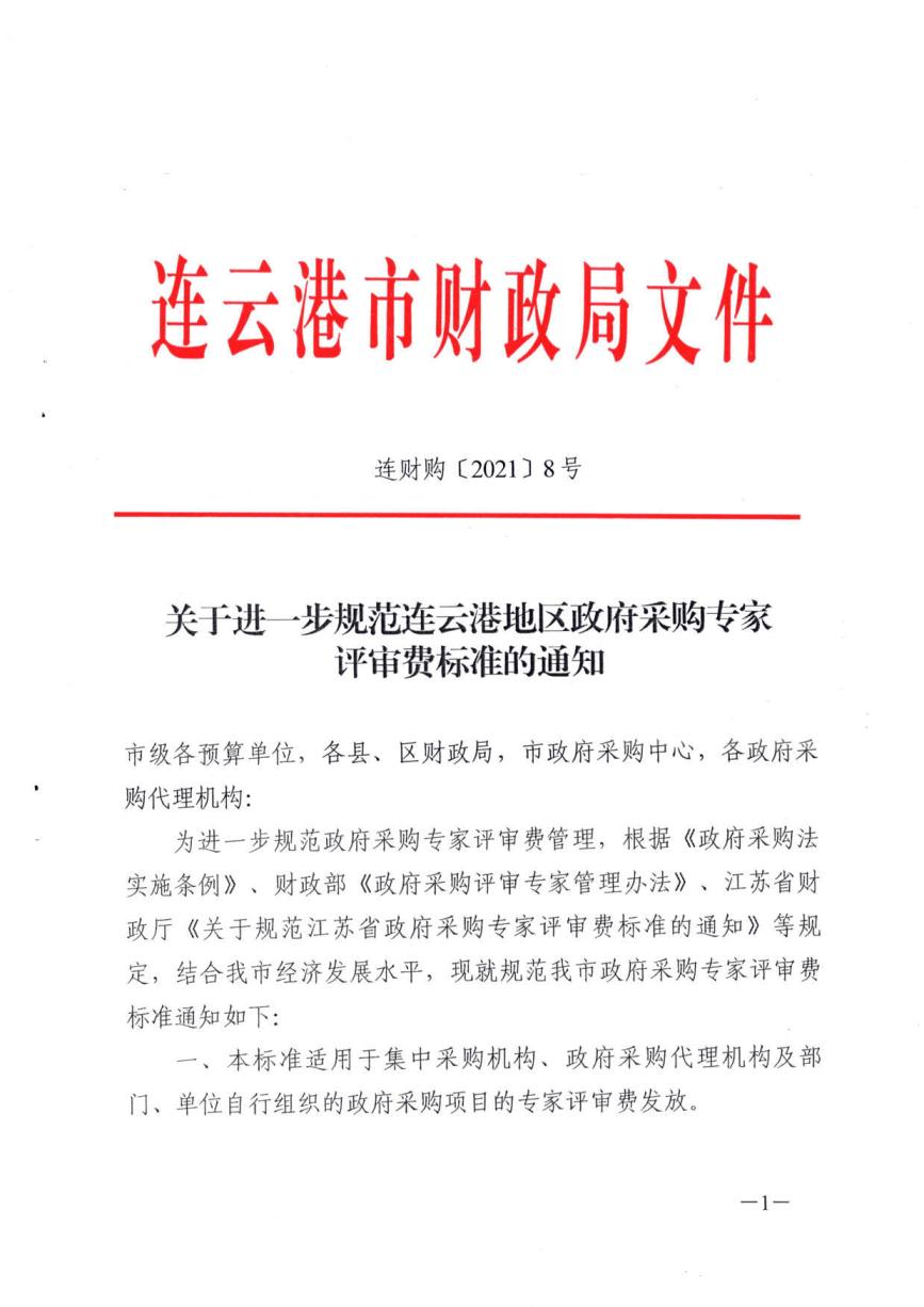关于进一步规范连云港地区政府采购专家评审费标准的通知(连财购〔2021〕8号)