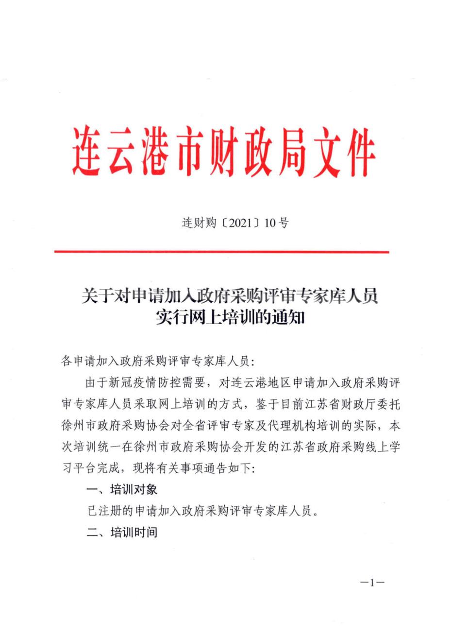 关于对申请加入政府采购评审专家库人员实行网上培训的通知(连财购〔2021〕10号)