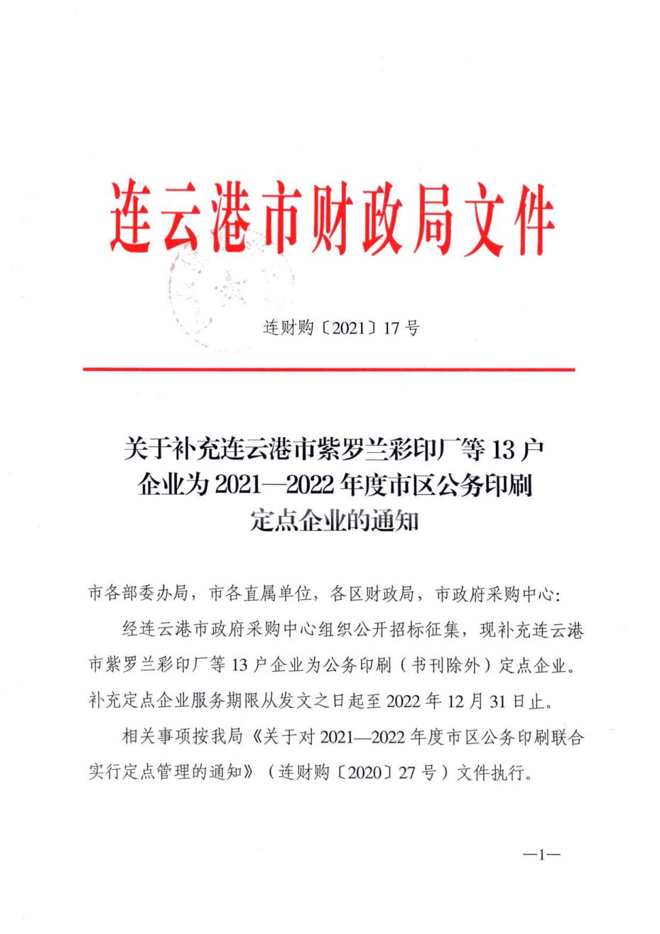 关于补充连云港市紫罗兰彩印厂等13户企业为2021—2022年度市区公务印刷定点企业的通知(连财购〔2021〕17号)