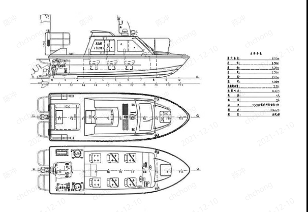 所须船类型:单体、单甲板、单机单桨,舷内外柴油机动力驱动的折角型滑行艇,艇体及上层建筑须采用玻璃纤维增强塑料制造,可用于交通、执法等多种用途,航行于内河A级航区。