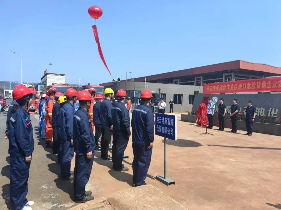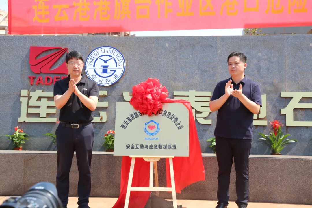 7月3日上午,连云港港旗台作业区港口危险货物企业安全互助与应急救援联盟成立揭牌仪式在连云港泰地石油化工有限公司门前广场举行,市交通运输局副局长吴亚东、市应急管理局副局长黄学智、市交通执法支队支队长杨永建、连云港港口控股集团副总裁尚锐以及市交通运输局、应急管理局、港口控股集团相关部门负责人,旗台作业区港口危货企业及联盟的领导和相关人员参加揭牌仪式,吴亚东、黄学智共同为联盟揭牌。