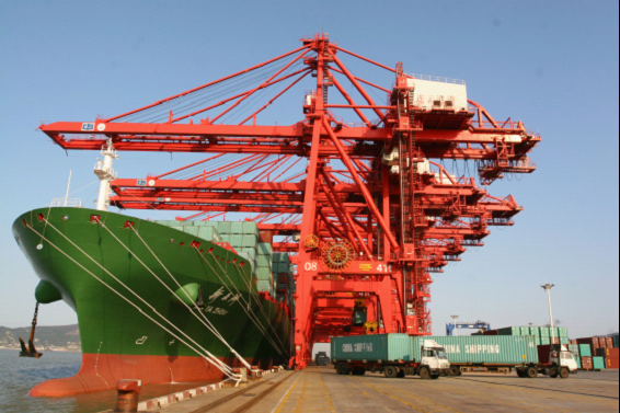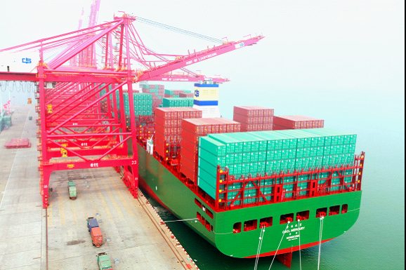 2007年10月9日,我国自行设计建造的第一艘特大第六代集装箱船——“新亚洲”集装箱班轮安全靠泊连云港港。