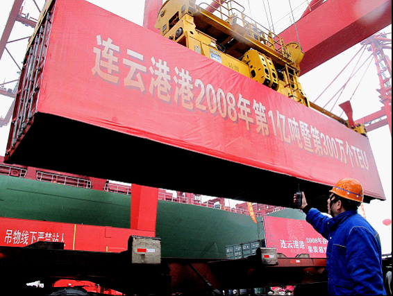 2008年12月28日,连云港港吞吐量突破1亿吨,集装箱达300万标箱,成功迈入中国亿吨大港行列,江苏沿海首个亿吨大港由此诞生。