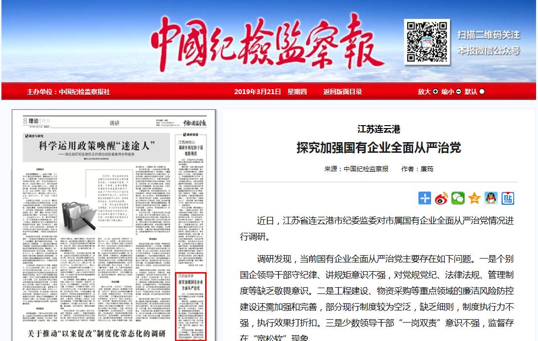 近日,江苏省连云港市纪委监委对市属国有企业全面从严治党情况进行调研。