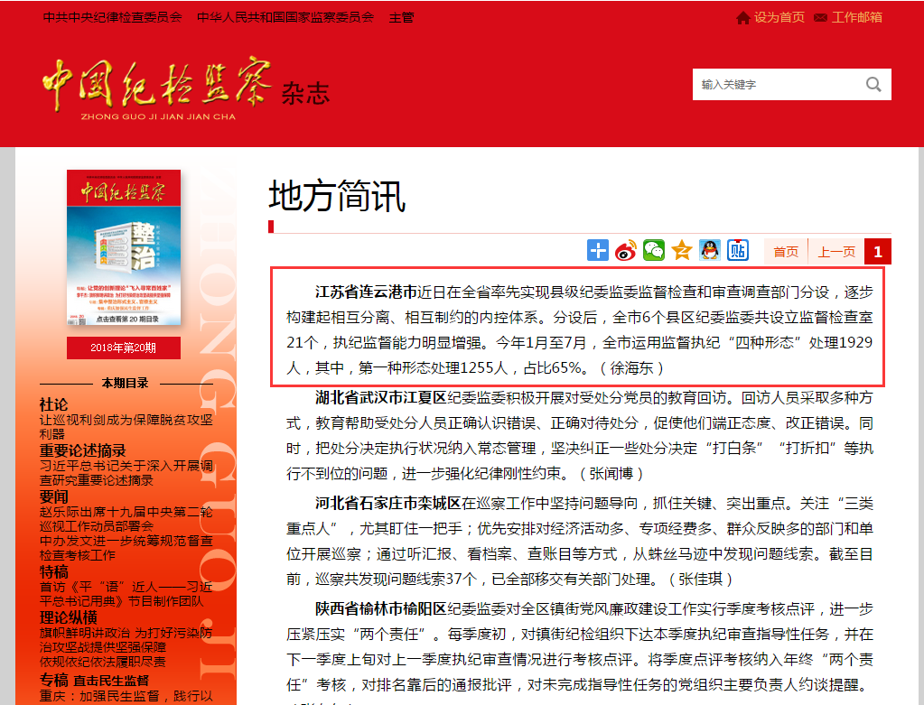 江苏省连云港市近日在全省率先实现县级纪委监委监督检查和审查调查部门分设,逐步构建起相互分离、相互制约的内控体系。分设后,全市6个县区纪委监委共设立监督检查室21个,执纪监督能力明显增强。今年1月至7月,全市运用监督执纪“四种形态”处理1929人,其中,第一种形态处理1255人,占比65%。(徐海东)