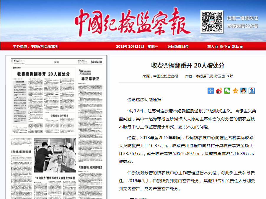 图为《中国纪检监察报》10月23日第6版截图 违纪违法问题通报 9月12日,江苏省连云港市纪委监委通报了3起形式主义、官僚主义典型问题,其中一起为赣榆区沙河镇人大原副主席仲崇段对分管的镇农业技术服务中心工作监管流于形式、履职不力的问题。 经查,2013年至2015年期间,沙河镇农技中心向辖区各村实际收取犬类防疫费共计16.87万元,收取费用过程中向各村开具收费票据金额共计33.76万元,虚开收费票据金额16.89万元,造成村集体资金16.89万元被套取。 仲崇段对分管的镇农技中心工作管理监督不到位,对此负主要领导责任。2019年4月,仲崇段受到党内警告处分。其他19名相关责任人分别受到党内警告、党内严重警告处分。 ●事件回顾 2012年至2016年2月,仲崇段任沙河镇人大副主席。根据组织安排,2013年至2015年,仲崇段分管沙河镇农技中心工作。 同一时期,汤成建担任该镇农技中心主任,负责农技中心全面工作。 2013年3月1日,新的《江苏省动物防疫条例》施行,明确规定所有犬只必须进行防疫处理。为开展狂犬病防控,赣榆县决定持续开展全县狂犬病防疫活动,所需狂犬病疫苗、免疫证等防疫物资统一供应,各镇按照规定收取一定的免疫费用。 2013年6月,汤成建参加全县犬防疫工作会议回到镇里后,第一时间向分管领导仲崇段汇报有关情况,随后,汤成建召集镇农技中心工作人员开会,会上汤成建进行了分工,分区域安排专人按照每条狗10元钱的标准向各村收取犬防疫费。 “汤主任,收费这种事比较麻烦,各村的积极性都不高,可能很长时间都收不上来。”农技中心副主任刘某某对此有些担心。 “要不然发点奖励?”汤成建沉思片刻后决定,“让咱们收费的人按照各村实际收取防疫费的两倍金额开具票据,各村回去后按照开具的票据金额入账,虚开的一半犬防疫费由村干部自己处理,这样他们的积极性就高了。” 当汤成建将犬防疫收费安排情况汇报给仲崇段后,他程序性地安排着此项工作:“既然省里有文件规定可以收费,镇农技中心就按照文件要求来执行即可。” 随后的时间里,仲崇段就再也没有过问这项工作,以至于对镇农技中心收费情况、各村实际缴纳情况一概不知。 就这样,违规的收款票据一开就是3年。 ●查处经过 2017年12月,赣榆区纪委在执纪审查时发现,沙河镇联合村党支部书记卢某,在2014年向镇农技中心缴纳犬防疫费过程中,虚开收费票据,在村里报销后套取资金,导致村集体资产流失等问题。 2018年5月,区纪委当即将此线索转至沙河镇纪委。按照程序,沙河镇纪委立即开展初核,找相关人员进行谈话并调取书证材料。 为弄清事情真相,核查组首先找到卢某了解情况。 “联合村的犬防疫工作这几年是如何开展的?2014年村里犬防疫费用收取情况是怎样的?”核查人员问道。 “村干部按照标准向农户收取犬防疫费用。2014年村里实际收取的犬防疫费是1600元,交至镇农技中心后,他们开具收费金额3200元。扣除农户缴纳的费用在村里报账后,多报出来的1600元钱归我个人所得了。”卢某如实交代了自己的违规违纪行为。 问题线索看似查清楚了,可事情并没有结束。 “除了联合村,其他村是否还存在类似情况?”这个问题引起了核查组的重视。 核查组仔细查阅了镇农技中心的相关账目,核对各村关于此项工作的入账凭证,发现几乎各村都是按照农技中心实际入账金额的两倍在村里报销入账。 核查组立即找到汤成建了解情况:“你是否知道各村犬防疫费用报账金额与实际不相符的事情?” “考虑各村对犬防疫工作不是很配合,所以我想用这种方式,提高大家收取、缴纳费用的积极性。开票时金额按照实际收取的两倍数额开具。”汤成建说。 经立案调查,2013年至2015年,沙河镇农技中心向各村开具收款票据金额合计33.76万元,实际收取犬防疫费为16.87万元,虚开收费票据金额16.89万元,造成村集体资金16.89万元被套取(2013年实际收取某村300元,票据金额为800元)。 2018年12月5日,汤成建受到党内严重警告处分。 经赣榆区纪委常委会会议研究并报区委同意,2018年12月7日,赣榆区纪委对仲崇段涉嫌履职不力问题进行立案审查。 “由于我对分管的镇农技中心工作监管不力、失察失职,导致村集体资金16.89万元被套取。对此,我负有不可推卸的责任,愿意接受组织处理。”仲崇段在接受谈话时进行了反省。 2019年4月10日,仲崇段受到党内警告处分。包括汤成建在内的其余19名相关责任人分别受到党内警告、党内严重警告处分。各村集体被套取的16.89万元资金被追回。(本报通讯员陈玉成 李静)