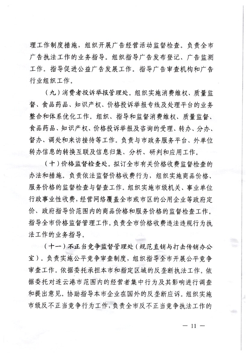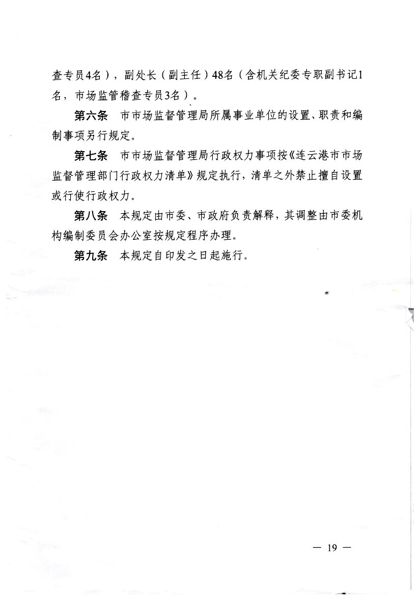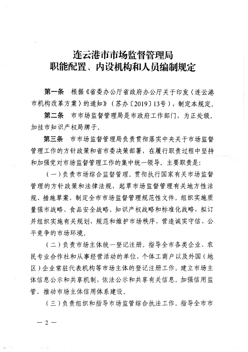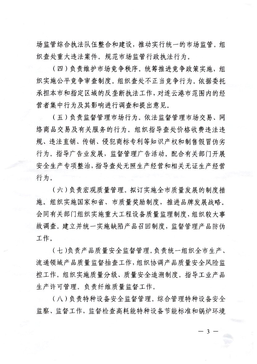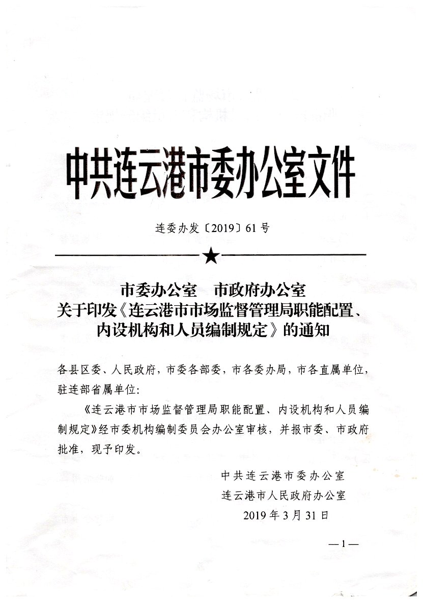 市委办公室 市政府办公室 关于印发《连云港市市场监督管理局职能配置、内设机构和人员编制规定》的通知