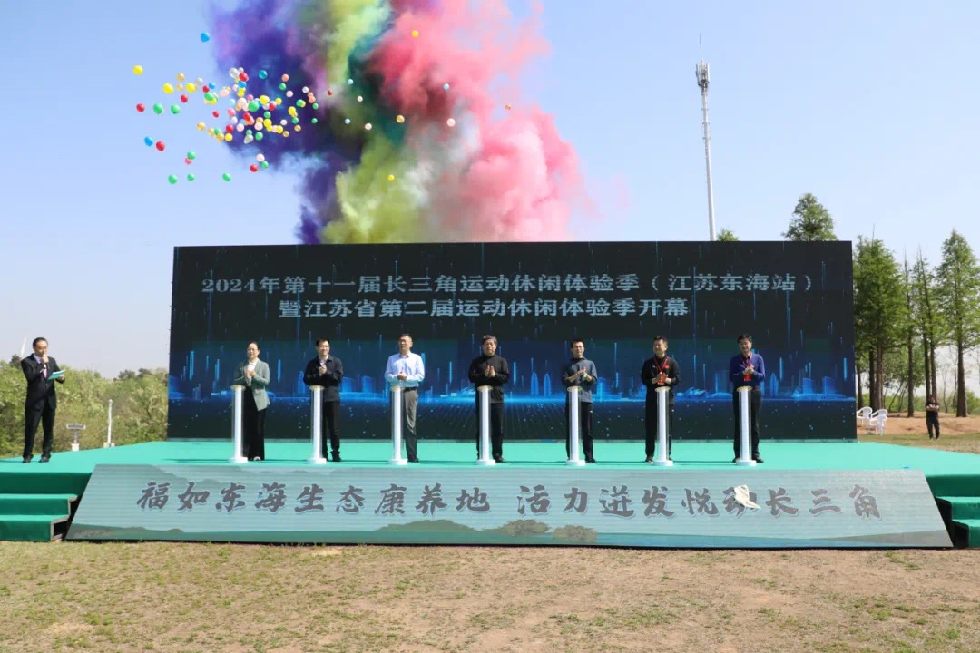 4月26日,2024年第十一届长三角运动休闲体验季(江苏东海站)暨第二届江苏省运动休闲体验季在青松岭森林公园开幕。江苏省体育局一级巡视员王志光及上海市、浙江省、安徽省体育局、体育中心相关负责人,副县长李宝芹出席活动。