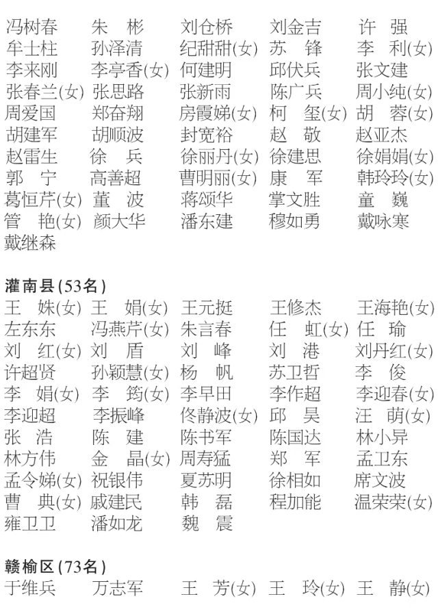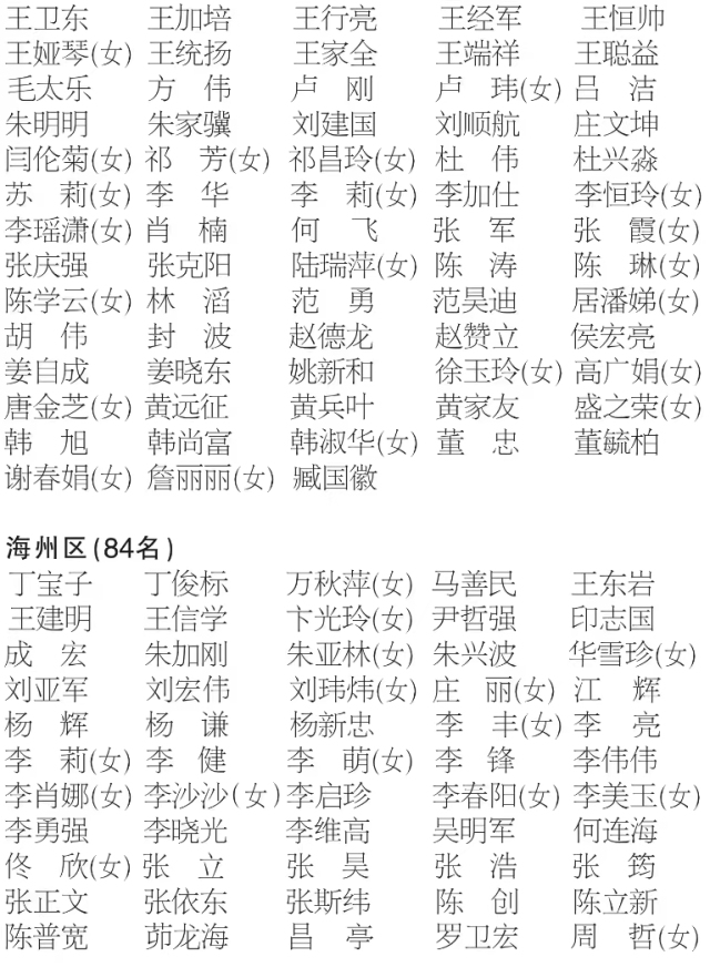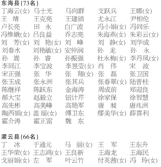 连云港市十五届人民代表大会代表名额为419名,各县区和解放军驻连部队依照选举法和省选举实施细则的规定,实际选出419名。连云港市第十四届人大常委会第四十四次会议根据代表资格审查委员会提出的代表资格审查报告,确认选举产生的419名代表的代表资格全部有效,现将名单予以公告(以姓氏笔画为序):