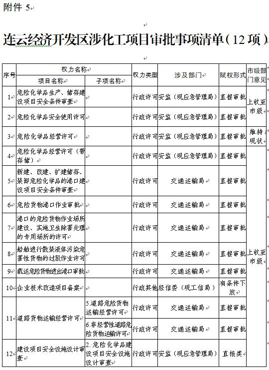 5.连云经济开发区涉化工项目审批事项清单(12项)