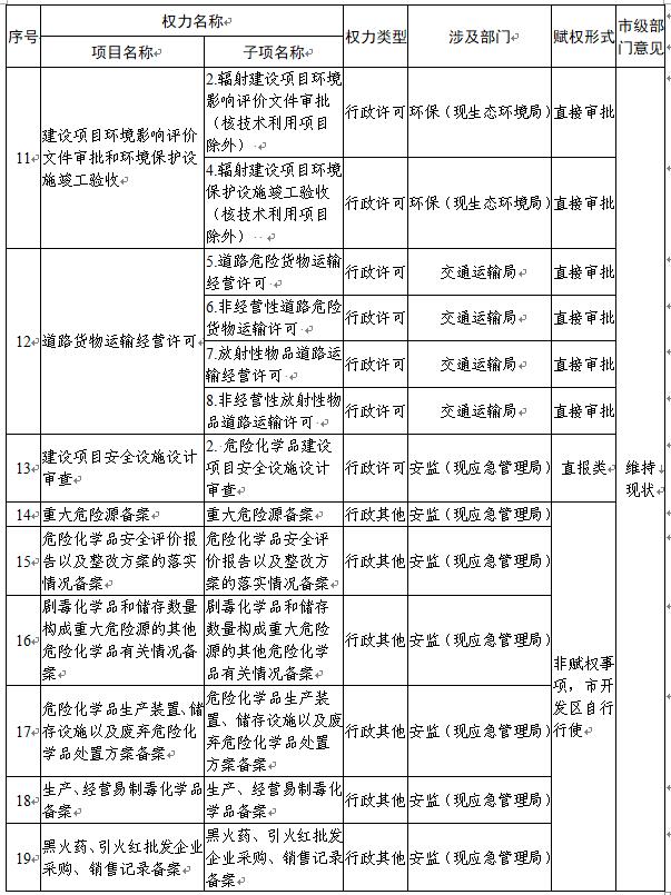 一、市开发区“危险化学品生产、储存建设项目安全条件审查”等19个行政权力事项由市开发区行使。