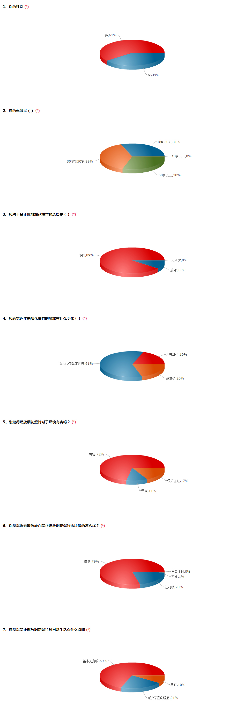 本次问卷调查共有104位热心市民参与,男性占61%,主要年龄段在18-50岁,89%的市民对于禁止燃放烟花爆竹表示赞同,80%的市民感觉感觉近年来烟花爆竹的燃放有减少,72%的市民觉得燃放烟花爆竹对于环境有害,99%的市民对政府在禁止燃放烟花爆竹这块做的工作表示认可,69%的市民觉得禁止燃放烟花爆竹对日常生活有什么影响。