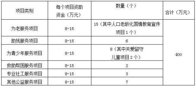 本次公益创投活动将按照6大类申报(每个项目资助金额平均8-15万元左右),各项目实施主体根据项目规模、效益和投入等合理申报。社会组织应积极开辟渠道自筹资金。项目资助资金根据最终核定的金额拨付。具体分配情况明细如下:
